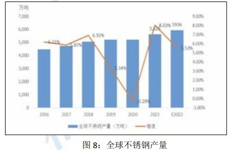 3.1 全球不銹鋼產量維持快速增加,預計2022 年全球不銹鋼產量將達到 5936 萬噸,同比增加 5.53%。