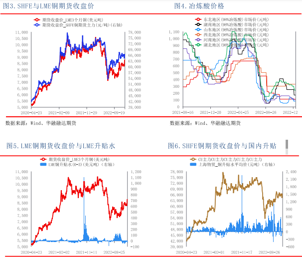 供應端: 近期礦端擾動出現,主要是第一量子在巴拿馬的Cobre Panama礦山。根據ICSG數據顯示, Cobre Panama年產能350千噸,占全球產能的1.9%。智利Ventanas港口發生大火, Ventanas港口是銅精礦的主要出口港,占智利銅精礦總出口的近17%,秘魯LasBambas發運仍然不暢。短期tc價格維持高位, 國內2022年11月精煉銅產量98.6萬噸,同比增長12.4%。進口銅砂,精煉銅、銅材11月份維持同比增長,滬倫比值回落下,12月及之后的進口料有所回落。