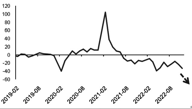 2022年在美聯儲持續加息的影響下,全球需求集體走弱,摩根大通全球制造業PMI自2022年年初以來持續下滑,至12月已經降至榮枯線以下,錄得48.6%,近10年來僅次于2020年疫情防控期間的歷史低位。外需走弱對我國出口的影響已經顯現,國內對外出口自2022年8月開始收縮,并于10月跌至負值,外需由經濟拉動項轉變為經濟拖累項。