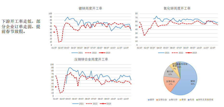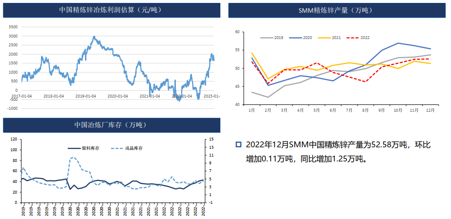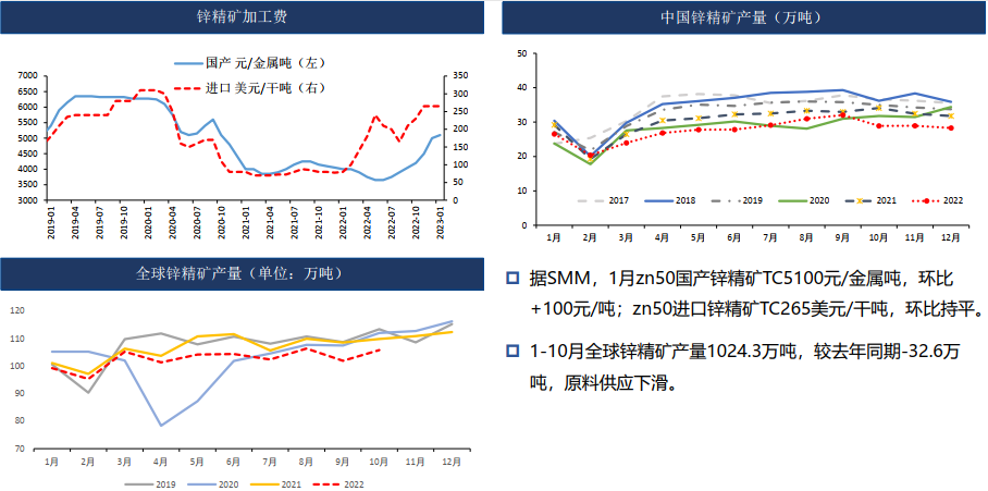四季度國內礦山生產淡季,但進口原料補充,原料供應寬裕,加工費上升明顯, 1月鋅精礦加工費5100元/噸,環比上升100元/噸。同時,鋅價高位,冶煉利潤尚可,冶煉開工率上升,國內大型冶煉廠春節期間預計維持高開工。?