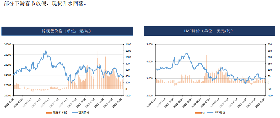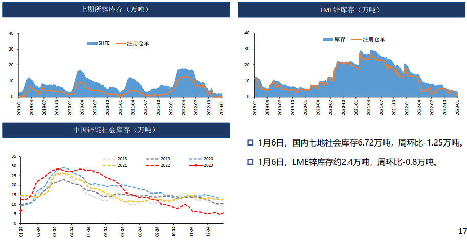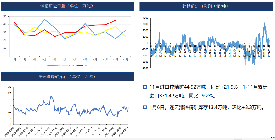四季度國內礦山生產淡季,但進口原料補充,原料供應寬裕,加工費上升明顯, 1月精礦加工費5100元/噸,環比上升100元/噸。同時,鋅價高位,冶煉利潤尚可,冶煉開工率上升,國內大型冶煉廠春節期間預計維持高開工。需求端,下游進入淡季,部分下游提前放假。歐美通脹高企,居民購買力下降,海外需求同時下滑明顯。當前國內庫存低位,預計疫情管控放松后貨運逐步改善,到貨量或逐步增加,同時下游需求仍偏弱,部分下游提前放假,鋅價偏弱震蕩。