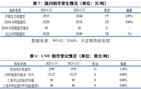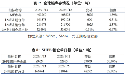 庫存方面,2023 年1 月12 日,SMM統計國內電解鋁社會庫存 64.2 萬噸,較上周四的庫存增加6.6 萬噸,較12 月底庫存增價 14.9 萬噸,較去年同期庫存下降8.3 萬噸。