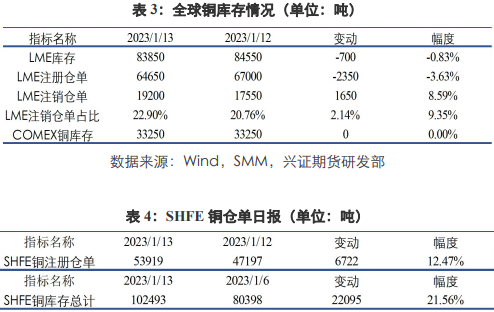 庫存方面,截至 1 月 13 日,SMM 全國主流地區銅庫存環比周一增加1.3 萬噸至 13.55 萬噸,較上周五增加 1.8 萬噸。從12 月末開始全國庫存已經連續 3 周增加,下游消費不佳是主因。