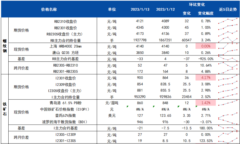截止1月13日15時,鐵礦石2305合約收盤價為881.0元/噸(+3.40%),日持倉量95.33萬手(+23454手)。
