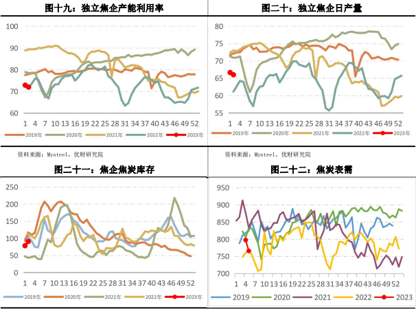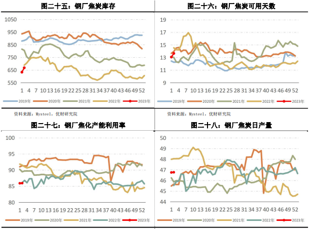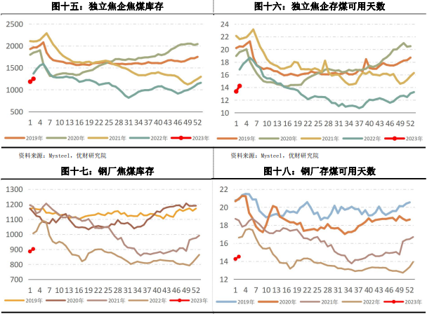 下游焦、鋼企業庫存延續回升趨勢,幾近春節,補庫期基本進入尾聲,節前可用天數預計落至 15 天左右的水平。當前需求邊際下滑確定,但當前庫存水平偏低也是確定的,當前庫存水平下如果節后需求高速回歸,大概率導致出現更強的補庫需求出現,是節后的潛在需求驅動。