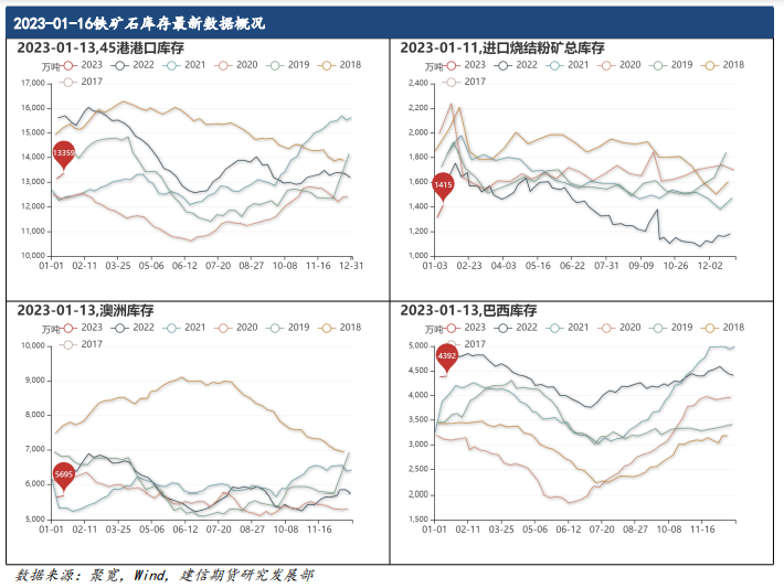 1月13日,45港鐵礦石庫存為13358.93萬噸,較上周增加1.74%,同比減少14.39%;鋼廠進口燒結礦庫存為1414.62萬噸,較上周增加7.77%,已連續增加4周;澳洲庫存為5694.83萬噸,較上周增加0.62%;巴西庫存為4391.88萬噸,較上周增加0.31%。