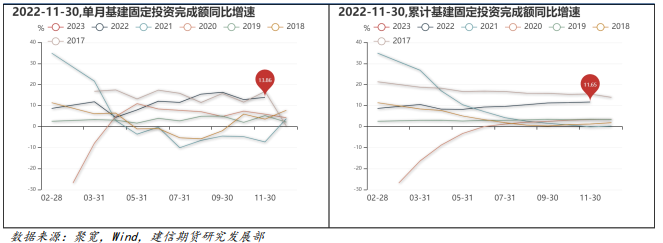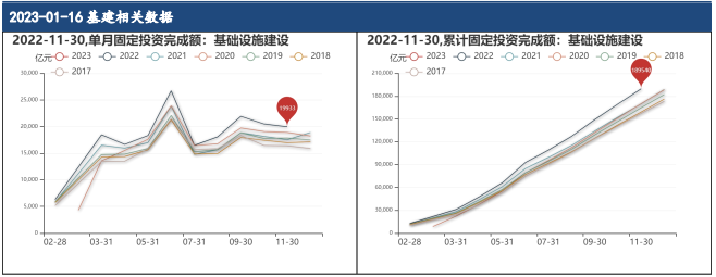 11月30日,基礎設施投資累計值為189539.88億元,同比增加11.65%,單月為19932.97億元,環比減少9.00%,同比增加13.86%,已連續減少3月。