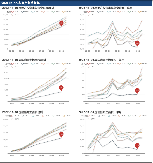 11月30日,房地產本年投資資金來源累計為136313.05億元,同比減少25.66%,單月為10832.93億元,較上個月減少3.12%,同比減少35.38%,已連續減少3月;房地產施工面積累計為896856.56萬平方米,同比減少6.54%,單月為7962.76萬平方米,較上個月減少20.17%,同比減少52.59%,已連續減少3月;房地產竣工面積累計為55708.82萬平方米,同比減少18.97%,單月為9144.24萬平方米,較上個月增加60.83%,同比減少20.23%,已連續增加3月;房地產銷售面積累計為121250.08萬平方米,同比減少23.32%,單月為10070.79萬平方米,較上個月增加3.21%,同比減少33.26%。