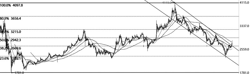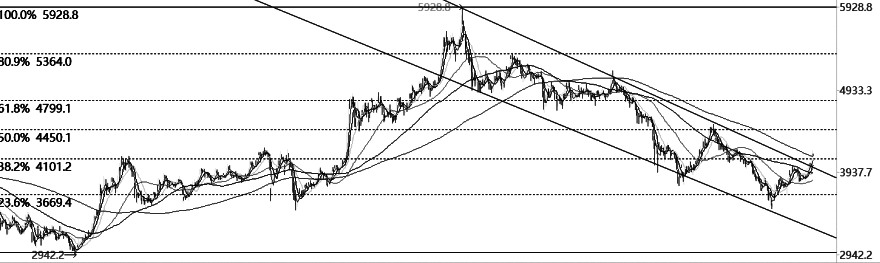 IH創出4115點上市以來的高點后開始回落,在黃金分割0.236對應的2330點止跌反彈。之后,接連突破60日均線、下跌通道上沿、黃金分割0.382對應的2670點,并開始測試黃金分割0.5對應的2940點的壓力位。此外,均線系統多頭排列,顯示走勢偏強。MACD指標金叉后持續發散,顯示走勢偏強。整體來說,IH突破下跌通道上沿,臨近2940點的壓力位,可關注2940點的壓制情況,暫時觀望為宜。