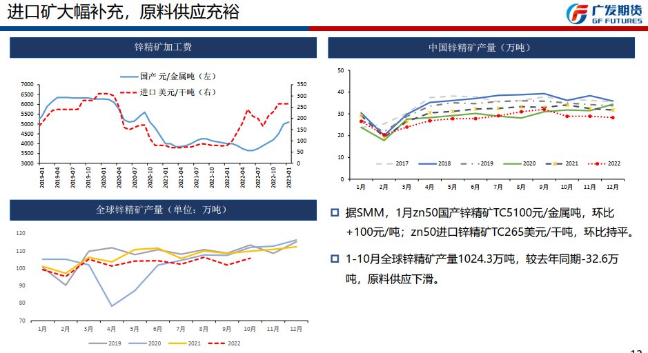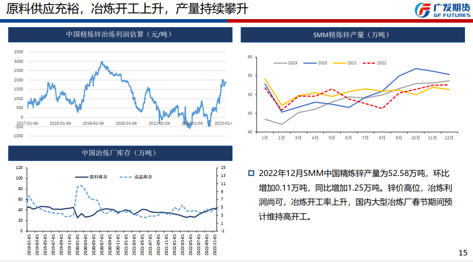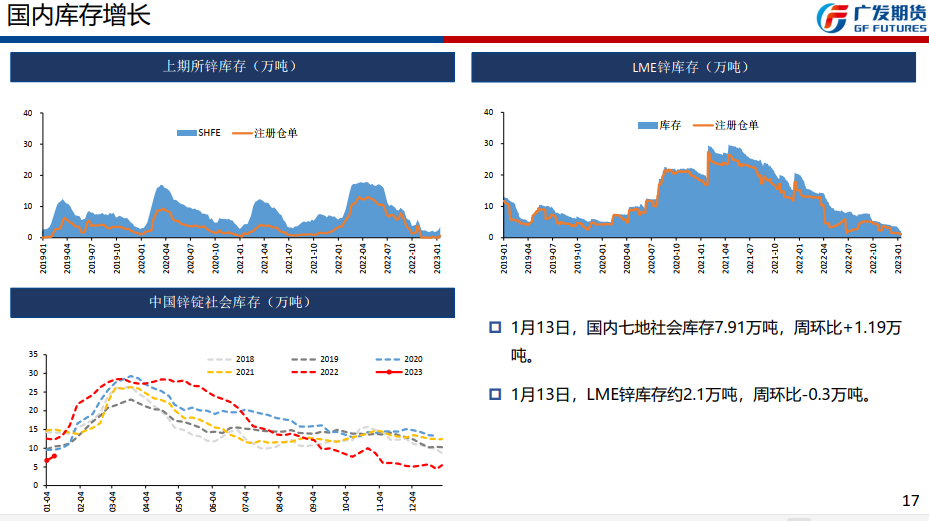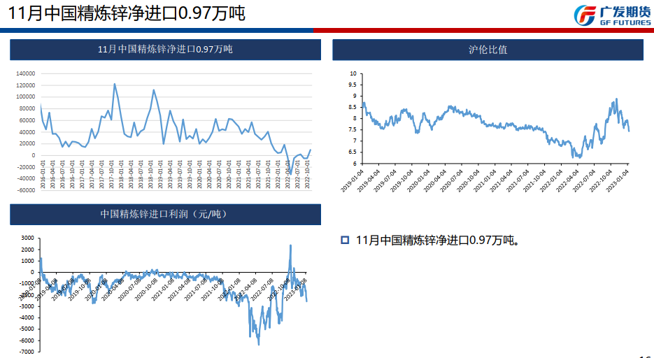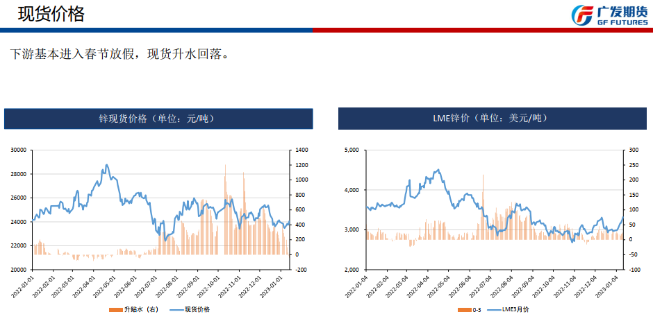 原料供應寬裕,加工費上升明顯,1月精礦加工費5100元/噸,環比上升100元/噸。同時,鋅價高位,冶煉利潤尚可,冶煉開工率上升,國內大型冶煉廠春節期間預計維持高開工。需求端,下游進入春節放假模式,開工率低位,需求偏弱。歐美通脹高企,居民購買力下降,海外需求同時下滑明顯。庫存小幅回升。人民幣升值,美國通脹如預期下行,美聯儲加息放緩預期增強,鋅價持續回升,需關注月底聯儲議息會議。短期利多集中釋放,主力上方空間或有限,關注24500-25000壓力。
