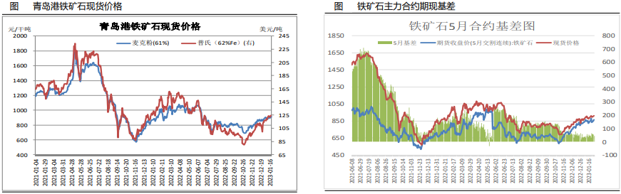 1月20日,青島港61%澳洲麥克粉礦報914元/干噸,周環比+4元/干;本周,鐵礦石現貨價格強于,20日基差為44元/噸,周環比+15元/噸。