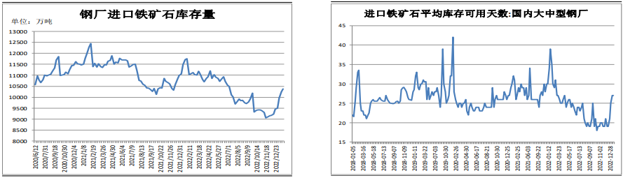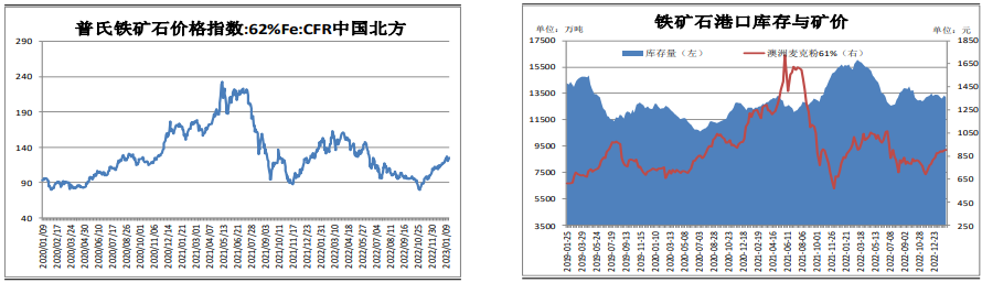 供應端,本期鐵礦石港口庫存由增轉降,同比降幅仍超2000萬噸,日均疏港量維持在320萬噸附近,鋼廠年前采購量增加。需求端,鋼廠高爐開工率及產能利用率小幅回升,日均鐵水產量處在220萬噸附近。