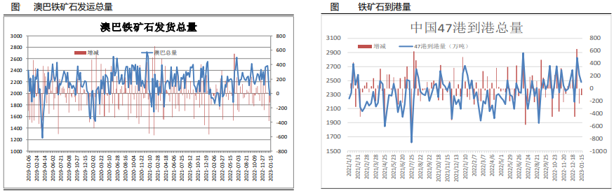 據Mysteel統計,本期澳大利亞、巴西鐵礦石發運總量為2193.8萬噸,環比減少73.6萬噸。1月9日-1月15日中國47港到港總量2476.9萬噸,環比減少109.7萬噸;中國45港到港總量2370.1萬噸,環比減少112.3萬噸;北方六港到港總量為1254.2萬噸,環比減少181.2萬噸。