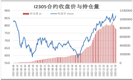 本周(0116-0120),I2305合約先抑后抑。I2305合約走勢強于I2309合約,20日價差為29元/噸,周環比+2元/噸。