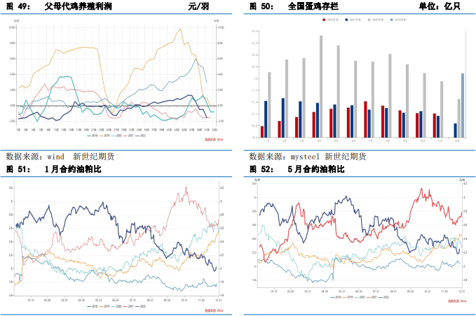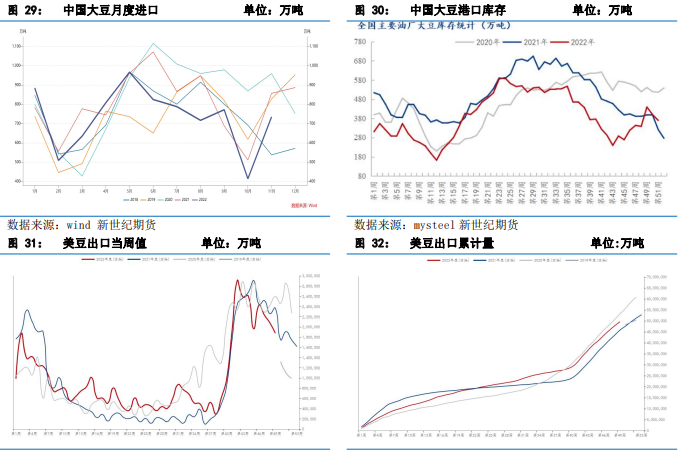 豆粕庫存雖然上升,但仍處于偏低水平,隨著集中到港,供應會轉為寬松。據Mysteel對國內主要油廠調查數據顯示,截止第 51 周(12 月 17 日至 12 月23 日)當周,豆粕庫存為50.39萬噸,較上周增加 13.93 萬噸,增幅 38.21%,同比去年減少 16.37 萬噸,減幅24.52%。我國大豆進口依賴度高,因為壓榨利潤不佳,2022 年下半年期間大豆到港量偏低,導致我國大豆的供給偏緊,開機率下降,豆粕供應趨緊,庫存量持續多月下滑,創歷史新低。不過大豆到港增加,豆粕庫存水平會逐步上升,供給會逐漸寬松,彌補庫存的下跌,而在南美大豆豐產的預期下,預計 2023 年的豆粕庫存壓力會逐漸緩解最終消失甚至轉為寬松。