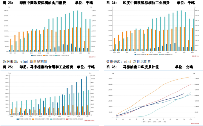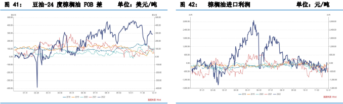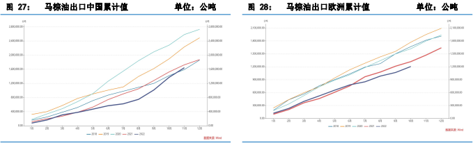 消費上歐盟及印度均無明顯亮點,生物柴油有很大不確定性,而中國的開放政策或推高2023 年油脂的消費水平,隨著疫情影響逐步消散,餐飲等行業景氣度將迎來修復。據ICEA,印度 1-11 月棕櫚油累計進口量為 788.1 萬噸,累計同比+6.8%,印度21/22 年度植物油累計消費近 1400 萬噸環比略增 3.67%,印度年食用油消費回升空間有限。中國是全球第二大棕櫚油進口國,隨著疫情政策放寬,餐飲消費復蘇或將帶動棕油進口需求增長。但是相對于印度而言,從2022 年上半年的表現能夠看出來,中國在棕櫚油消費上存在著很大彈性,且剛需消費有限,當棕油與其它植物油價差不合理時,國內終端一般不會選擇棕櫚油。