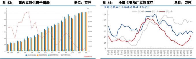 生豬價格對于我國 CPI 影響較大,因此出臺較多政策例如拋儲等,使得豬價緩慢上漲,同時高位的飼料價格也擠壓養殖利潤,抑制生豬補欄積極性和整體存欄量。由于目前能繁母豬恢復速度較緩慢,明年全年出欄量將會低于今年,對飼料消費也會產生一定影響。另外,隨著豆粕減量替代的實施,豆粕在飼料中的添加比例可能進一步降低,疊加當前生豬養殖利潤持續走低恐將打擊 2023 年生豬養殖戶補欄熱情,在 2023 年上半年豆粕需求可能難以提升。預計上半年相對慘淡,下半年改善幅度有限。