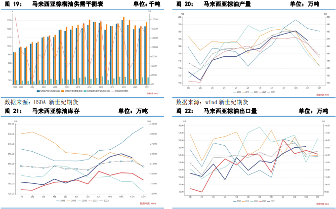 USDA12 月供需報告顯示,2022/23 年度全球棕油產量 7722 萬噸,較上一年度7382萬噸增加 340 萬噸,增幅 4.6%。全球棕油消費量 1.269 億噸,全球棕油庫存1657 萬噸,較上年度下降 1.1%,庫消比 13.06%,若要達到歷史最低庫消比對應的期末庫存量,仍需在當前庫存水平下降 642 萬噸。