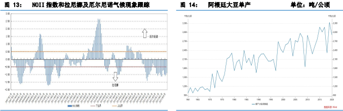 歷史上連續三年拉尼娜的情況確實罕見。從 NOAA 自 1950 年的記錄來看,曾出現過類似三重拉尼娜現象。1954-1956 年和 1973-1976 年期間暫沒有對應單產數據,從1998-2001年間南美大豆綜合單產來看表現并不差,阿根廷單產也同樣如此。從拉尼娜強弱上看,1973-1976年以及 1998-2001 年三重拉尼娜,阿根廷降雨隨著拉尼娜強度在第三年末到下一年初的減弱而得到明顯改善。