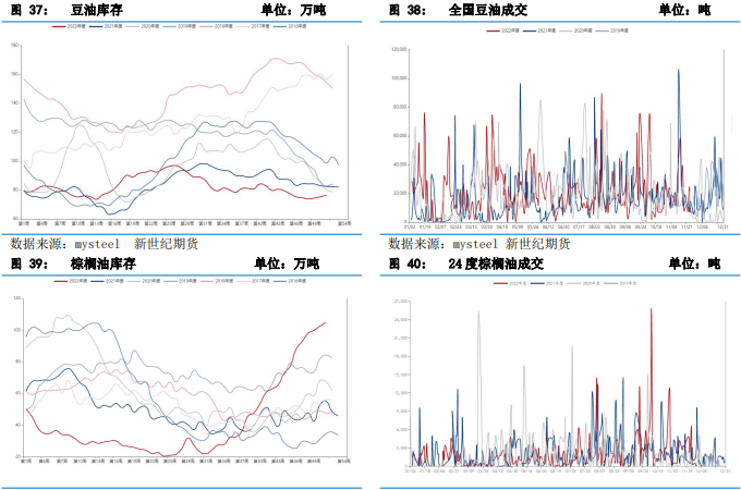 目前國內棕櫚油庫存高企,豆油庫存無壓力。據 Mysteel 調研顯示,截至2022年12月23日(第 51 周),全國重點地區豆油商業庫存約 76.455 萬噸,較上周增加1.153 萬噸,漲幅1.53%。全國重點地區棕油商業庫存約 104.96 萬噸,較上周增加 2.51 萬噸,增幅2.45%;同比增加56.26萬噸,增幅 115.52%。