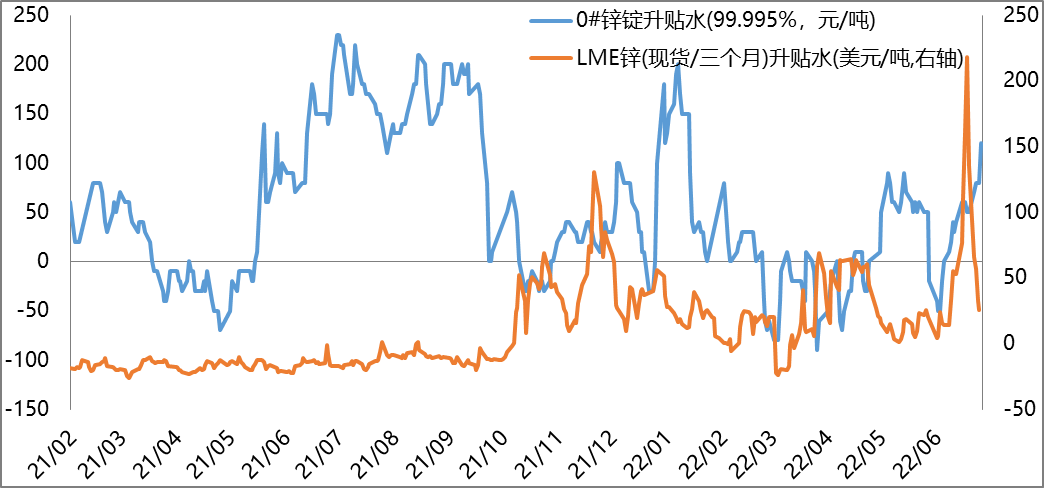 截止2022年7月1日,上海0#鋅錠現貨較期貨升水120元/噸,較上周+70元/噸;LME現貨較期貨升水25.75美元/噸,上周最高漲至218美元/噸。