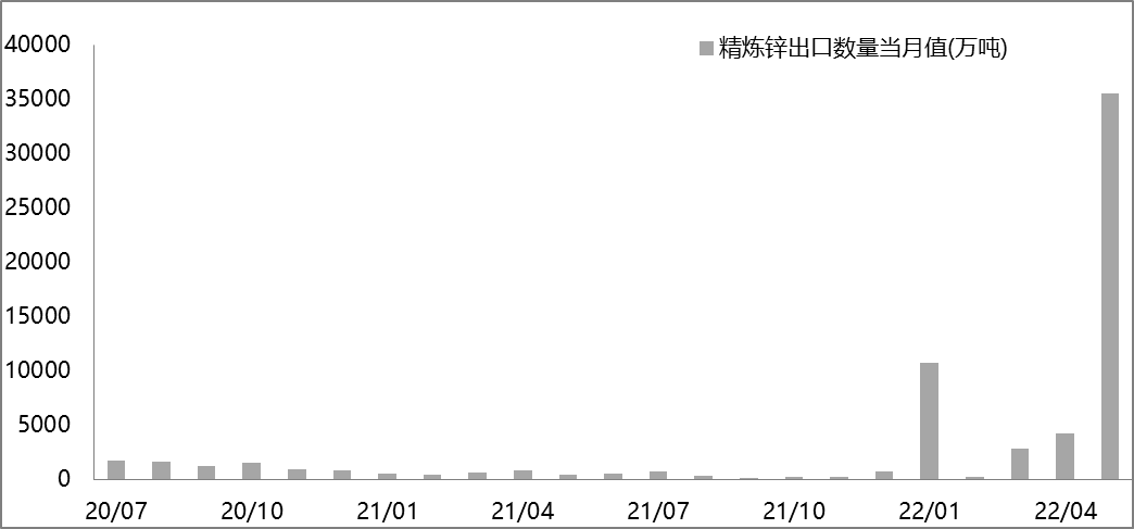 2022年5月精煉鋅出口35546噸,是去年同期的91倍,上月的8.5倍。因海外能源短缺引發精煉鋅減停產產能恢復進度緩慢,外強內弱促使出口量大增。