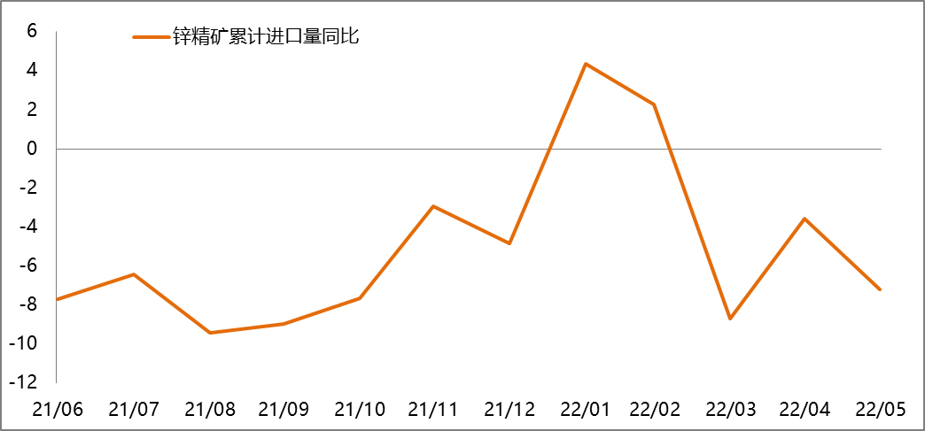 2022年5月鋅精礦進口24萬噸,環比-26%,同比-22%,2022年1-5月累計進口152萬噸,同比-7.19%,礦石供應相對偏緊。