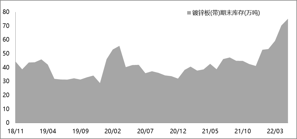 截止2022年5月,鍍鋅板(帶)期末庫存為75.22萬噸,環比+6.95%,同比+76%。
