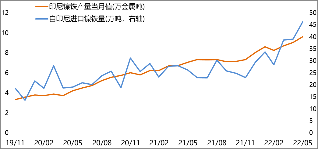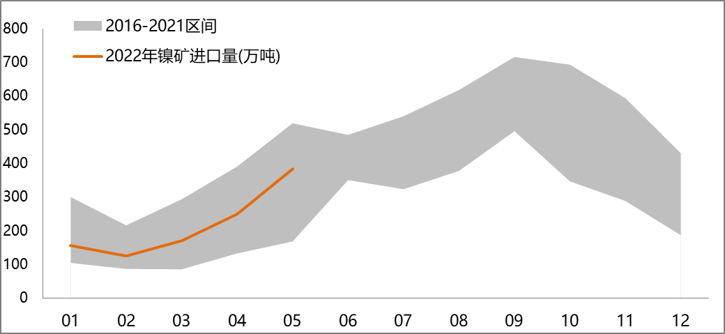 2022年5月進口鎳礦384萬噸,環比+54%,同比+5%。菲律賓雨季結束后,鎳礦出貨量增加。