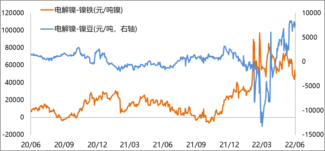 截止2022年7月1日,電解鎳較鎳鐵溢價為47950元/噸鎳,較上周-550元/噸鎳,鎳鐵經濟性優勢明顯(生產不銹鋼)。