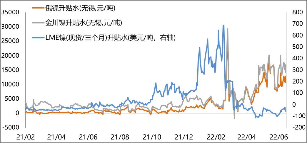 截止2022年7月1日,俄鎳現貨升水期貨10750元/噸,金川鎳現貨升水期貨14200元/噸,分別較上周+1200/-450元/噸;當周LME鎳現貨貼水三個月期貨日均55美元/噸,較上周收斂15美元/噸。