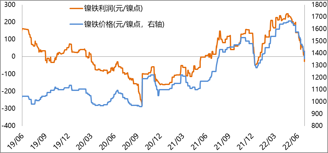 截止2022年7月1日鎳鐵平均生產利潤出現虧損27.8元/鎳點,上周盈利54元/鎳點。