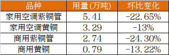 據Mysteel調研,中國主要品牌空調企業6月份總生產量1334萬臺,環比5月份減少13%,同比減少20%。6月份總用銅量為12.01萬噸;其中紫銅管總用銅量8.06萬噸,黃銅總用銅量3.95萬噸。