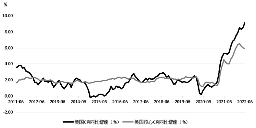 疫情疊加俄烏沖擊加劇,閉合緩慢的商品供應缺口令全球通脹壓力抬升,并先后迫使歐美央行開啟貨幣正常化。據統計,截至今年一季度末,美聯儲資產負債規模達到8.9萬億美元,歐洲央行資產負債規模同樣高達8.7萬億歐元。在能源脫鉤加劇的背景下,今年6月,美國消費者物價指數(CPI)同比上漲9.1%,創1981年12月以來的新高,其中核心CPI同比上漲5.9%。超預期的CPI數據再次讓市場強化了對美聯儲激進鷹派的預期。在經歷了6月15日美聯儲加息75個基點后,市場對于7月下旬議息會議上美聯儲將再度加息75—100個基點、9月繼續加息50—75個基點的預期大幅升溫。