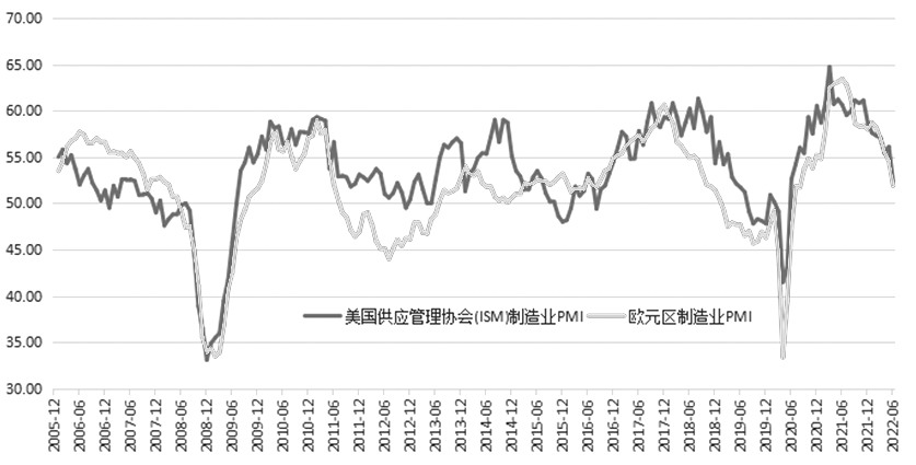 圖為歷年歐美制造業PMI走勢