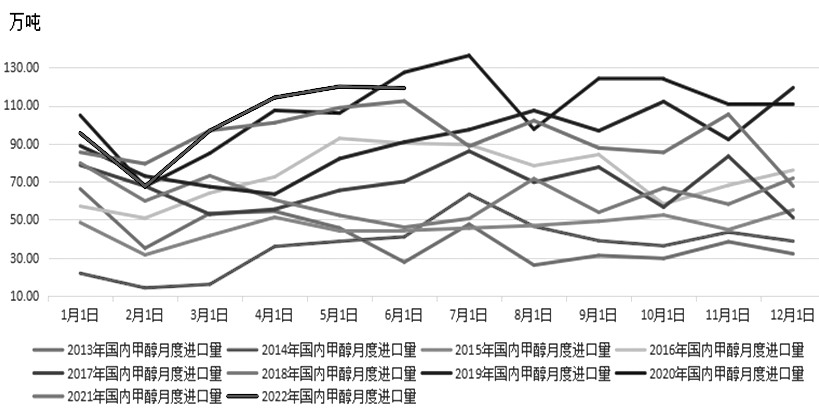 圖為國內甲醇進口量走勢