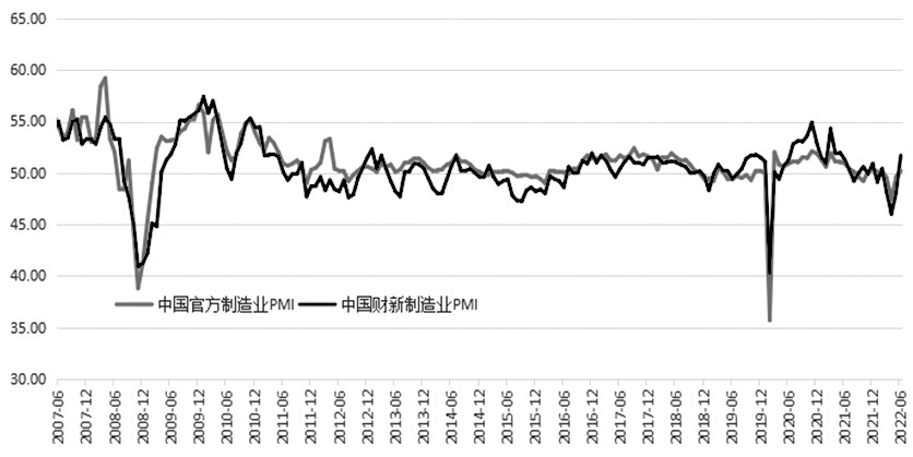 圖為我國官方和財新制造業PMI走勢