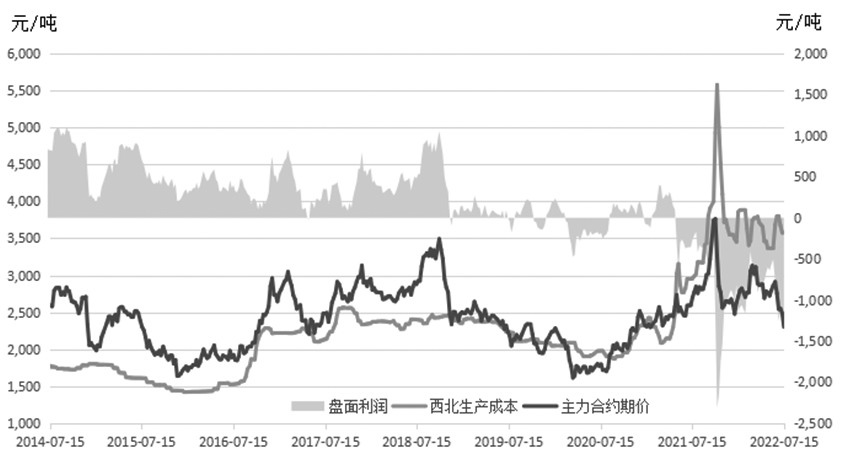 圖為西北地區煤制甲醇成本及盤面利潤變動