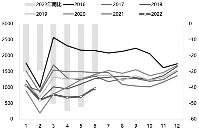 房地產以弱復蘇為主,前端投資修復尚需時間。2022年上半年,房地產數據走弱。1—5月,房地產投資、到位資金、商品房銷售面積(金額)、土地購置面積、房屋新開工(施工)面積同比分別下降4%、25.8%、23.6%、31.5%、45.7%、30.6%和1%。其中,土地購置面積、商品房銷售面積和房屋新開工面積已分別連續9個月、9個月和10個月出現負增長。