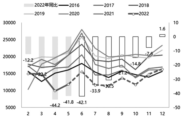 與此同時,上半年,受電爐提前大范圍減產的影響,螺紋鋼等長材產量下降幅度遠高于板材。1—6月,相關機構統計的螺紋鋼累計產量同比減少17.91%,五大品種鋼材累計產量之和同比僅減少9.7%。其中,長流程螺紋鋼廠減產15.53%,短流程螺紋鋼廠減產35.76%。截至7月8日,螺紋鋼短流程產量已接近2021年10月能耗雙控期間的低點。目前,廢鋼價格大幅回調,電爐減產空間較為有限。因此,預計下半年長流程鋼廠同比減產幅度將大于短流程鋼廠,板材減量將大于長材。據筆者推測,下半年,螺紋鋼供給環比、同比減量或低于粗鋼及其他品種的減量。