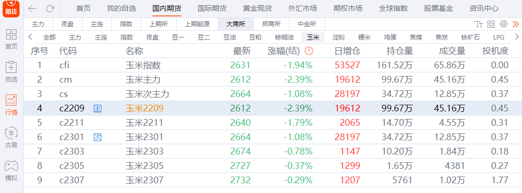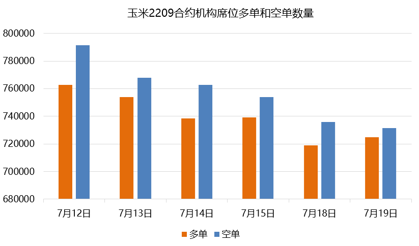 玉米2209合約,凈持倉數量排名前三席位的凈多單量明顯大于凈空單量,其中席位下的凈多單量比較突出。