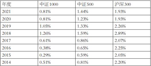 中證1000的股息率相對較低,不足1%,整體上低于滬深300股息率1個百分點。中證1000的股息率雖然有所波動,但總體呈上升態勢。中證500股息率提高速度較為明顯,2018年之后已經穩定在1%以上,但少有超過1.5%的情形。滬深300股息率相對較高,2019年之前略大于2%,2020—2021年略小于2%。