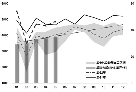高昂海運成本的回調及全球貨輪運力的擴張使得出口市場面臨雙重利好。汽車出口方面,5月汽車出口數量創歷史新高,出口市場延續2021年以來的高景氣水平。另外,5月4日歐盟普通法院一審裁決撤銷了歐委會對華卡客車輪胎的反傾銷和反補貼稅令,長達三余年的“雙反”告一段落,限制解除將修復企業出口意愿。