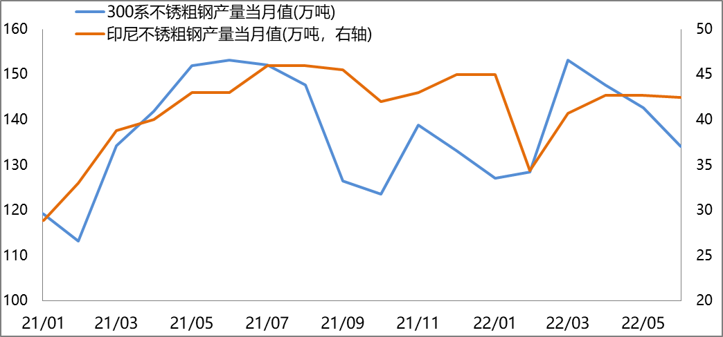 據51bxg統計,2022年1-6月,國內規模以上不銹鋼生產企業粗鋼產量為1689萬噸,同比減少173萬噸,減幅9%。其中,300系粗鋼產量819萬噸(占比48.5%),同比減少68萬噸,減幅8%。