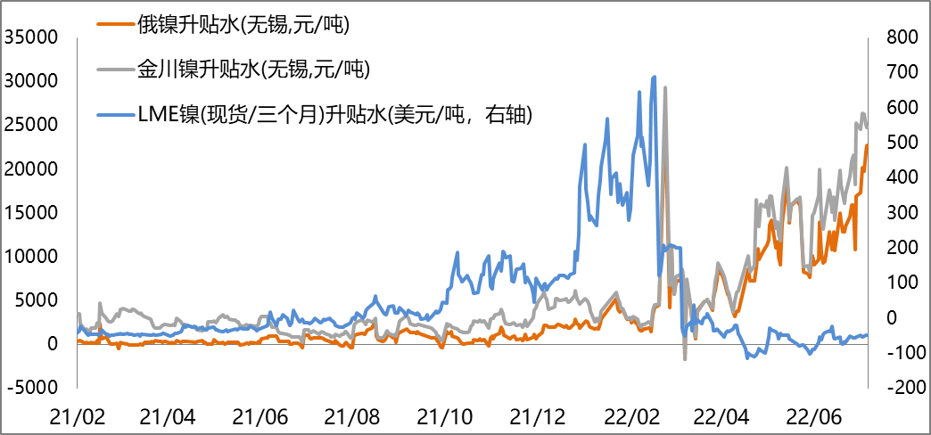 截止2022年7月22日,俄鎳現貨升水期貨22750元/噸,金川鎳現貨升水期貨24750元/噸,分別較上周+5800/-550元/噸;當周LME鎳現貨貼水三個月期貨日均50美元/噸,較上周收斂4美元/噸。