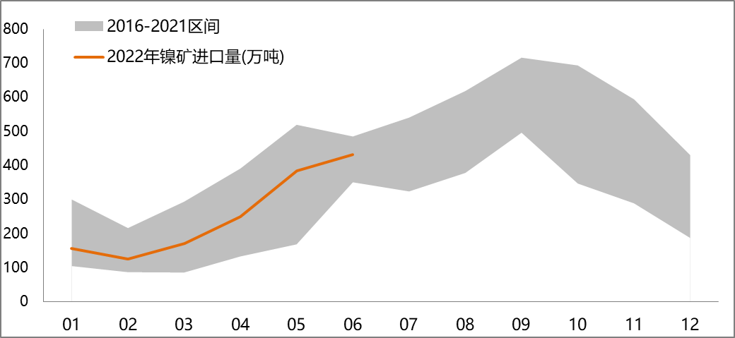 據海關總署數據顯示,2022年6月進口鎳礦431萬噸,環比+12%,同比-11%。2022年1-6月累計進口鎳礦1515萬噸,同比-8%。