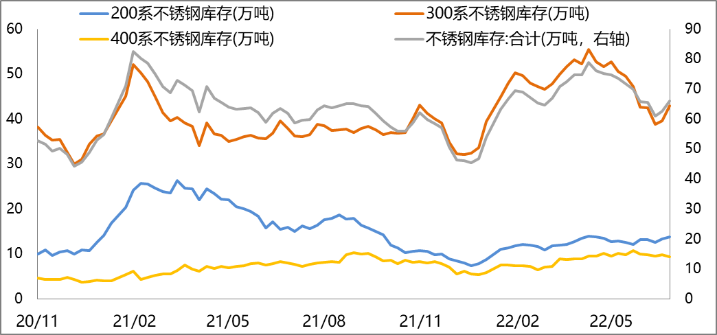 截止2022年7月22日,不銹鋼社會庫存為65.97萬噸,其中200系/300系/400系分別為13.77/42.86/9.33萬噸,較上周+0.42/+3.37 /-0.41萬噸。