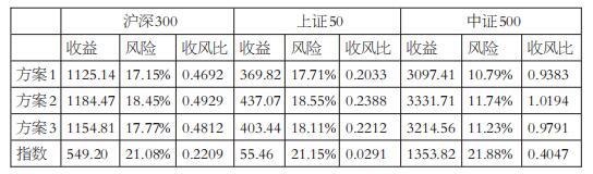 可以看出,方案1在收益、風險、收益風險比上都占優勢,且相較于現貨股指具有一定的超額收益。詳細分析數據發現,在股指期貨上市初期,移倉換月都會產生一定的正收益,特別是中證500,上市第一年大幅貼水,帶來了近6000點的超額收益。
