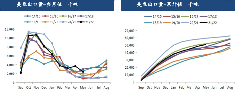 今年5月,美國出口大豆241.4萬噸,較去年同期的126.7萬噸增加114.7萬噸,同比增幅90.5%,較19/20年度的196.5萬噸增加44.9萬噸。
