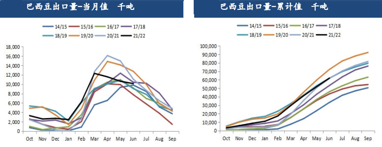 截至6月底,2021/22年度巴西累計出口大豆6196.1萬噸,較去年同期累計值6166.9萬噸回暖了29.2萬噸,同比增幅0.5%。